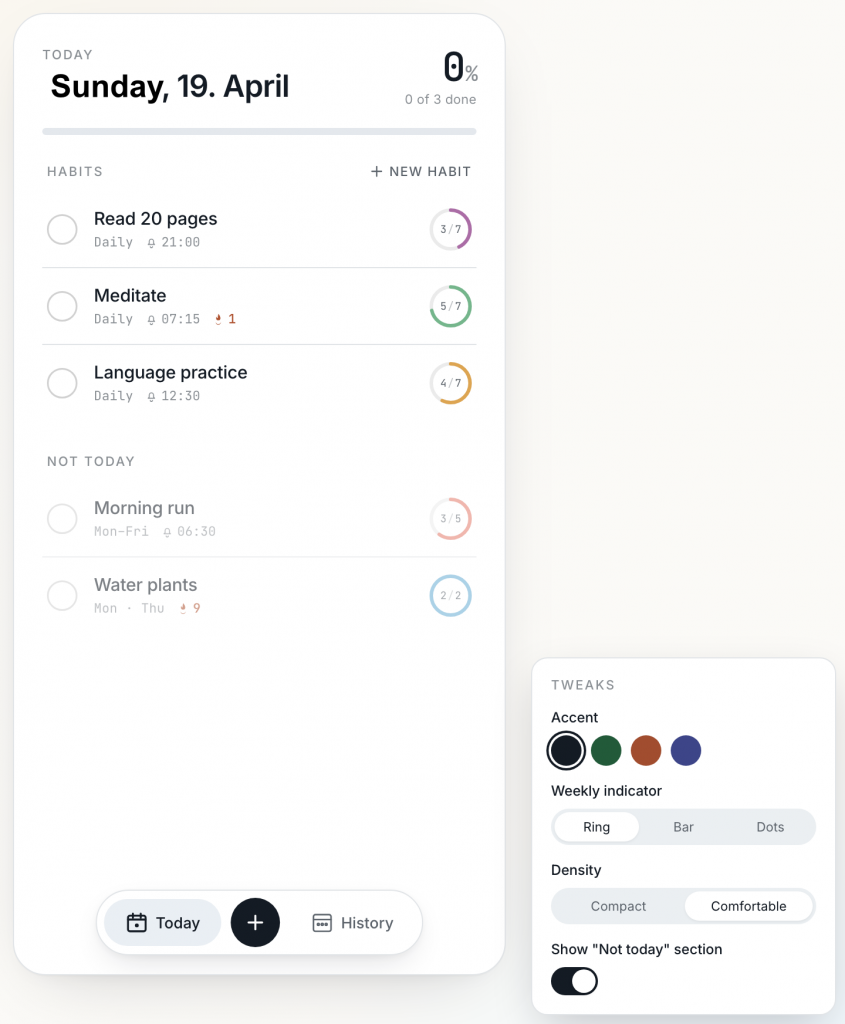 The cream background, terracotta accent, strikethrough on completed habits, the “Not today” section, the weekly rings. Not identical – the flame emoji became a droplet, the date header lost a touch of italic weight – but close enough that you’d use it.